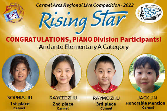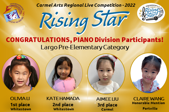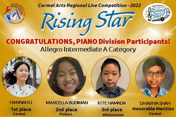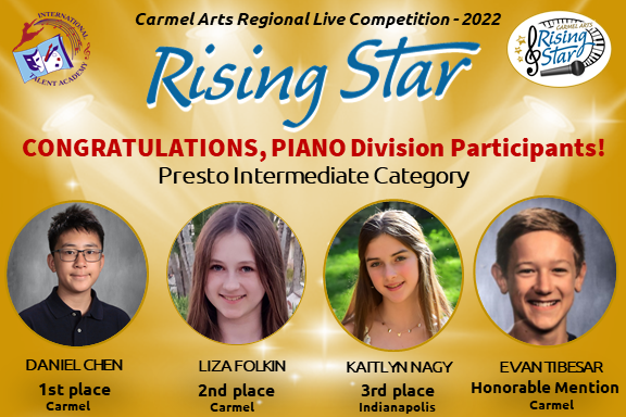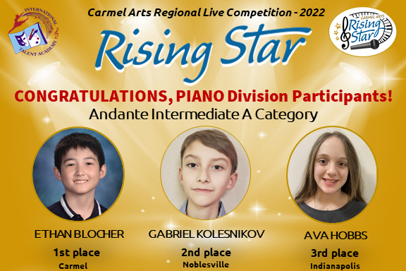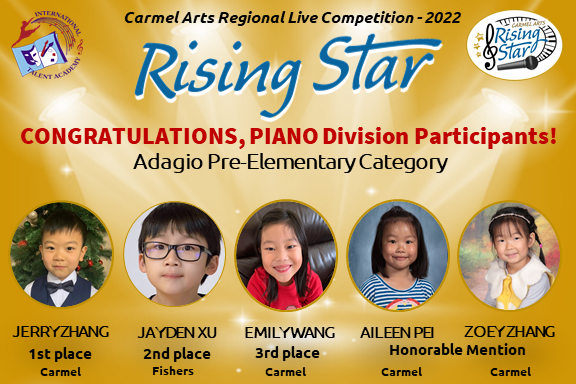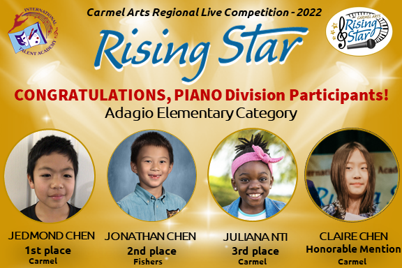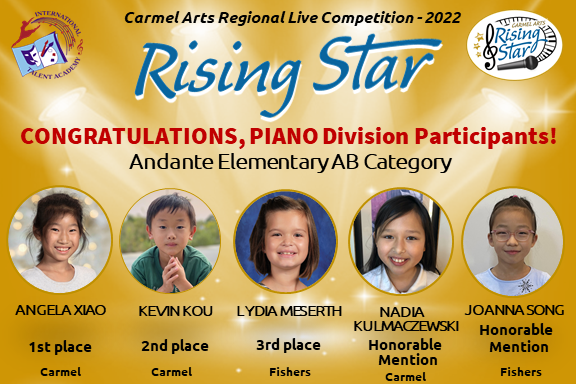 The first Rising Star competition brought 70 artists ages 5-18 that represent talent from 10 cities in Indiana: Carmel, Fishers, Zionsville, Westfield, Noblesville, Indianapolis, Brownsburg, Whitestown, Fortville, and Muncie from beginner – to advanced levels of music & arts. To make the judging the fairest for all, we divided participants not only by age groups, but also by experience. We would like to express our sincere gratitude to all teachers, parents and children for your hard work and dedication to music and performing arts!