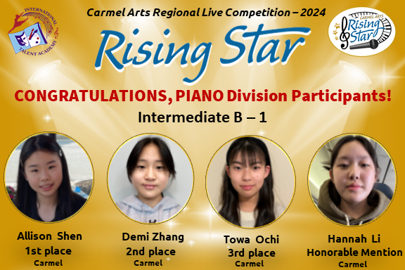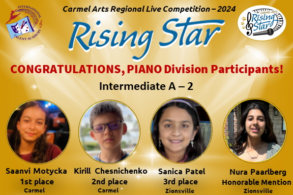 The 3rd Rising Star competition brought 72 artists ages 5-16 that represent talent from Carmel, Fishers, Fortville, Greenwood, Indianapolis, Mccordsville, Noblesville, Peru, Westfield, Whitestown, West Lafayette, Zionsville, Indiana; from beginner – to advanced levels of music & arts. To make the judging the fairest for all, we divided participants not only by age groups, but also by experience. We would like to express our sincere gratitude to all teachers, parents and children for your hard work and dedication to music and performing arts!