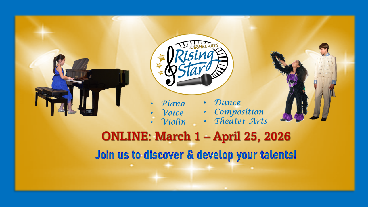 - Carmel Arts Rising Star International Competition Online welcomes young pianists, singers, actors, dancers, and freestyle performers from all over the World.